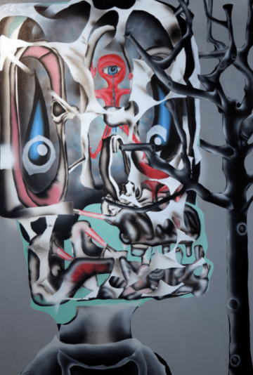 Na obraze je rozpadávající se kostlivec v podobném alegorickém duchu, jako u Davida Černého,. Práci maskéra chybí agresivita i krutost, jeho smutný kostlivec působí velice lidským dojmem a můžeme usuzovat, že se jedná o svého druhu autoportrét. Zatímco z očí ztékají slzy, ze spodní čelisti zbyly jenom části s několika zuby. Odtud se snaží osvobodit černěná postava s velkým modrým okem, sídlící uprostřed hlavy, přidržující se rukama o cáry vlající kůže. Jakýsi na smrti přežívající cizopasník, zastupující snad i autorovo ego. Zastupuje snad autorova nepřítele? Hranicemi Maskerových obrazů jsou skelety a ostny, mezi nimiž se rodí nový život.